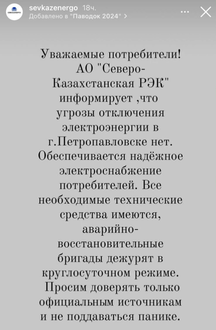 — Угрозы отключения электроэнергии в городе Петропавловске нет. Обеспечивается надежное электроснабжение потребителей. Все необходимые технические средства имеются, аварийно-восстановительные бригады дежурят в круглосуточном режиме. Просим доверять только официальным источникам и не поддаваться панике, — говорится в сообщении компании.