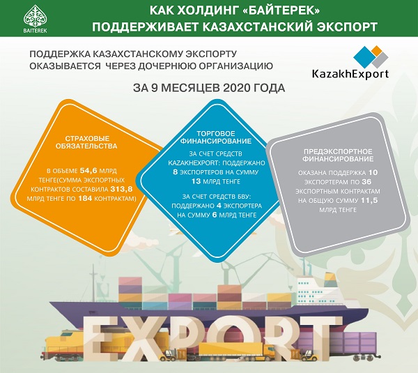 За 9 месяцев 2020 года торговое финансирование при участии KazakhExport получили 12 экспортеров на общую сумму 19 млрд. тенге, из них 8 предприятий поддержаны за счет средств акционерного общества на 13 млрд. тенге. Помощь с предэкспортным финансированием за этот период получили 10 экспортеров на 11,5 млрд. тенге.