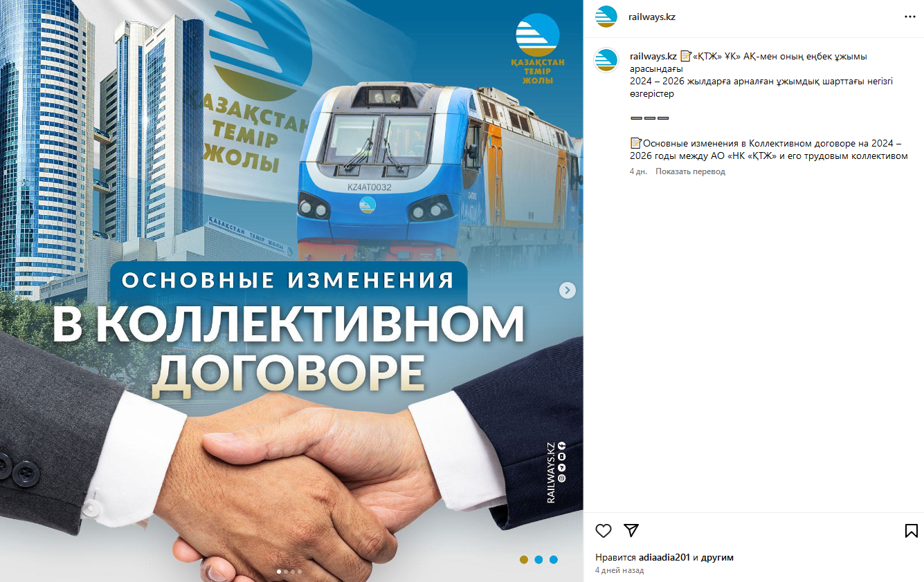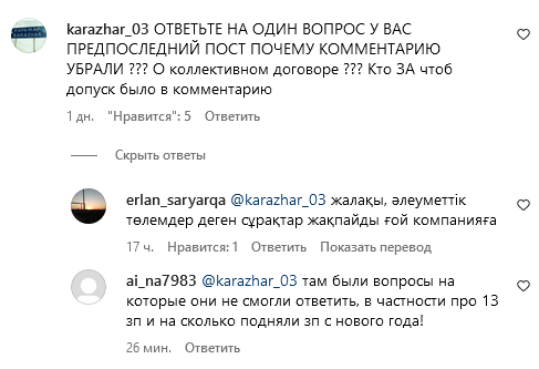 И еще один нюанс: в официальном Instagram «КТЖ»отключены комментарии к публикации про коллективный договор, а под следующими постами можно обнаружить записи от возмущенных железнодорожников, которые задали свои вопросы в пустоту.