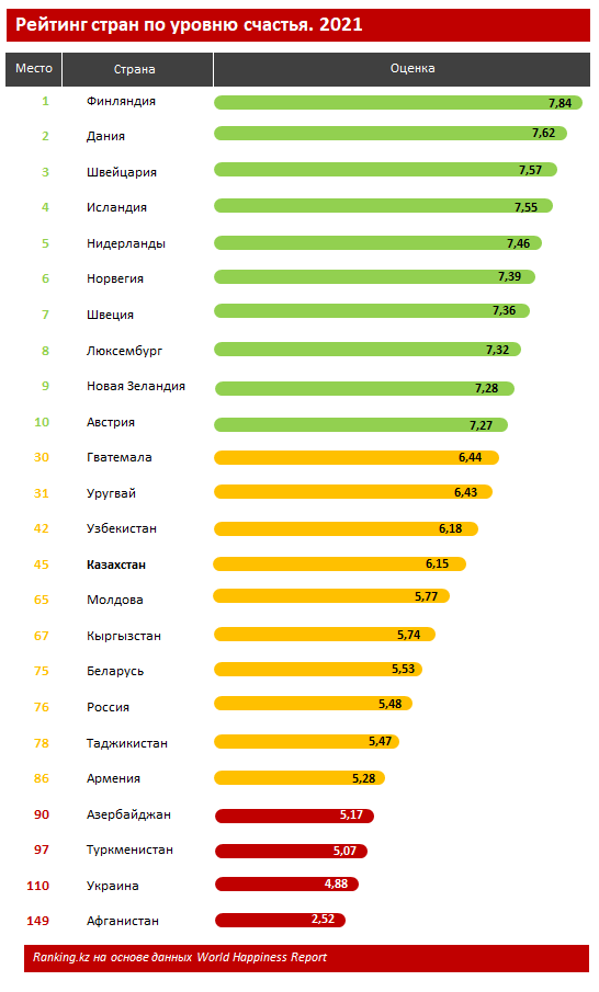 В рейтинге стран мира по уровню счастья Казахстан занял 45-е место из 149. За год страна улучшила позицию на 5 строчек (годом ранее — 50-е место), передает Caravan.kz со ссылкой на Ranking.kz.