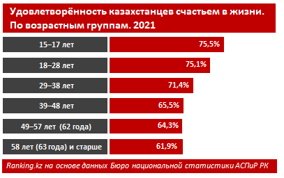 Чем старше казахстанец становится, тем менее он счастлив. Так, среди респондентов в возрасте 15–17 лет счастьем в жизни удовлетворены 75,5%, в возрасте 18–28 лет — 75,1%, от 29 до 38 лет — 71,4%, в возрасте 39–48 лет — 65,5%, от 49 лет до пенсионного возраста — 64,3%, среди пенсионеров — всего 61,9%.