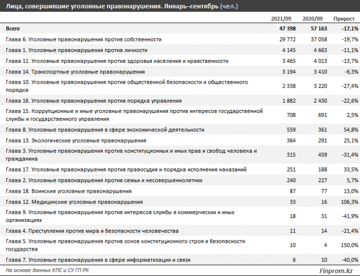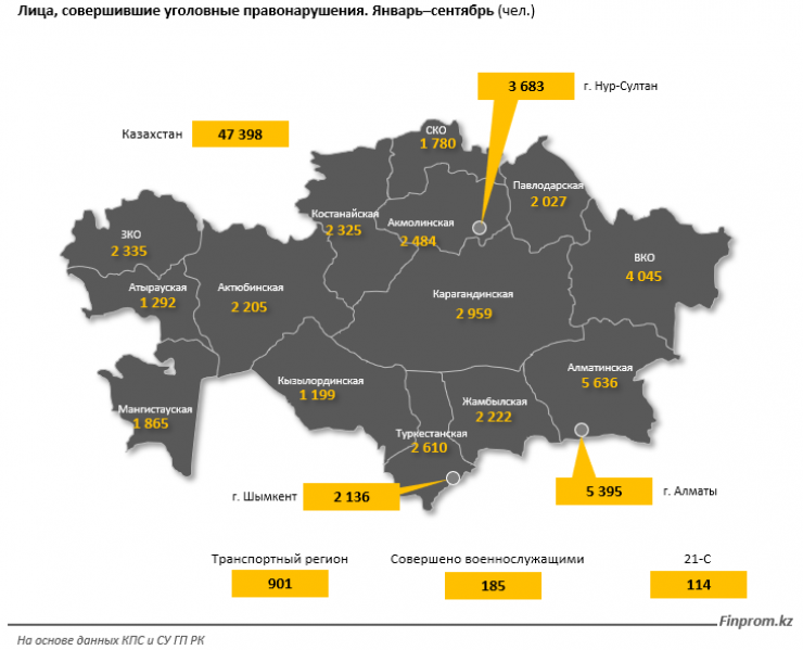За январь – сентябрь 2021 года уголовные правонарушения в Казахстан совершили 47,4 тысячи человек — на 17,1 процента меньше, чем годом ранее. "Лидеры" в региональном разрезе — Алматинская область (5,6 тысячи человек, минус 14,2 процента за год), Алматы (5,4 тысячи человек, минус 13,3 процента), а также Восточно-Казахстанская область (4 тысячи человек, минус 22,3 процента).
