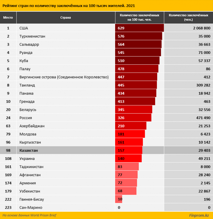 Открывают рейтинг "стран-тюрем" США и Сальвадор, замыкает Сан-Марино с нулевым количеством заключенных. Предпоследнее место заняла Гвинея-Бисау: 196 заключенных, или всего 10 на 100 тысяч населения.