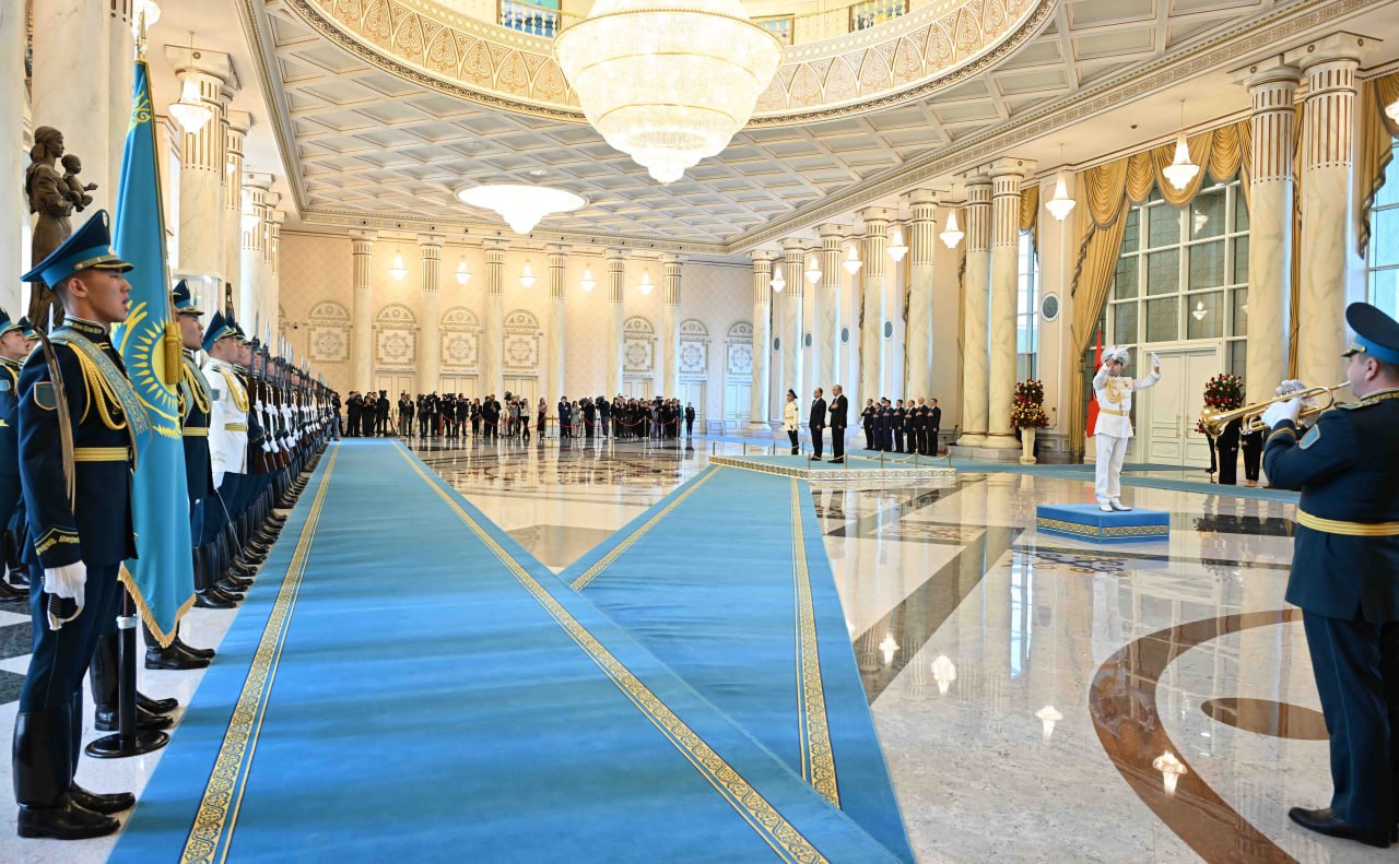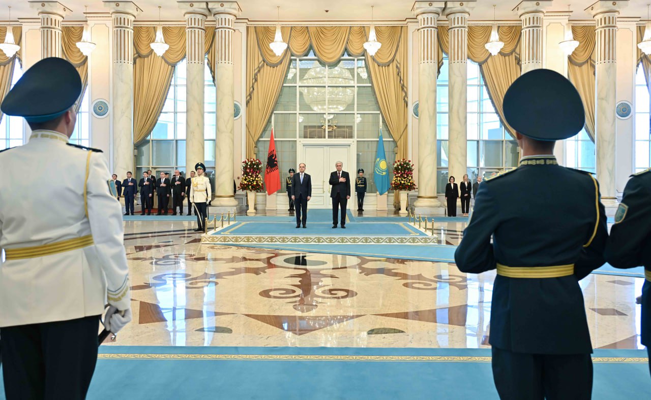 Начальник почетного караула отдал рапорт главам государств. После исполнения гимнов Казахстана и Албании Касым-Жомарт Токаев и Байрам Бегай представили друг другу членов официальных делегаций.