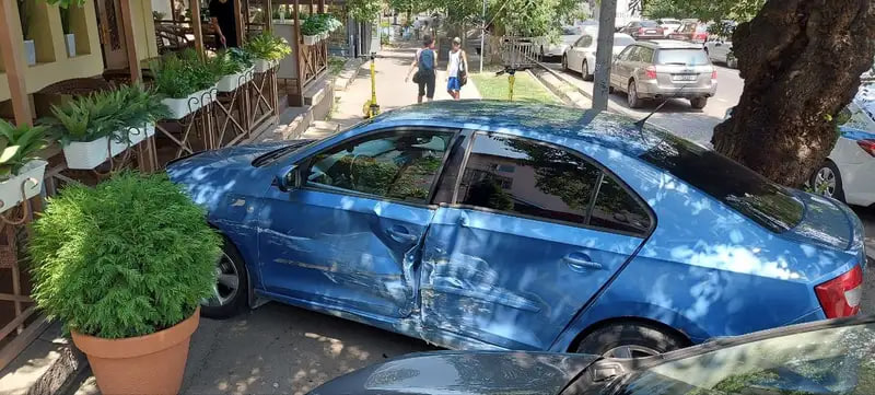 «Skoda» подрезала двигавшийся по левой полосе «Kia Rio». Водитель не успел среагировать и протаранил «Skoda» в бок. Оба автомобиля вылетели на тротуар. «Kia» встал поперек, а «Skoda» врезалась в кафе.