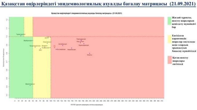 в "красной" зоне: Нур-Султан, Алматы и Акмолинская, Актюбинская, Карагандинская, Костанайская, Павлодарская области.