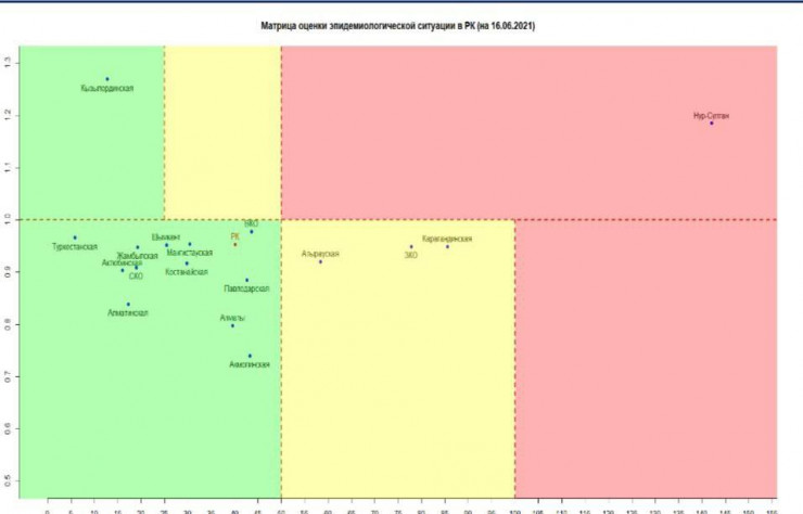 Согласно матрице оценки эпидемиологической ситуации в регионах Казахстана на 15 июня, в "красной" зоне остается Нур-Султан, передает Caravan.kz со ссылкой на МВК.
