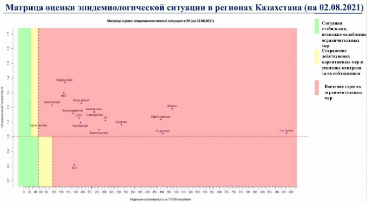 Об этом свидетельствует матрица оценки эпидемиологической ситуации в регионах Казахстана на 2 августа, передает Caravan.kz со ссылкой на МВК.