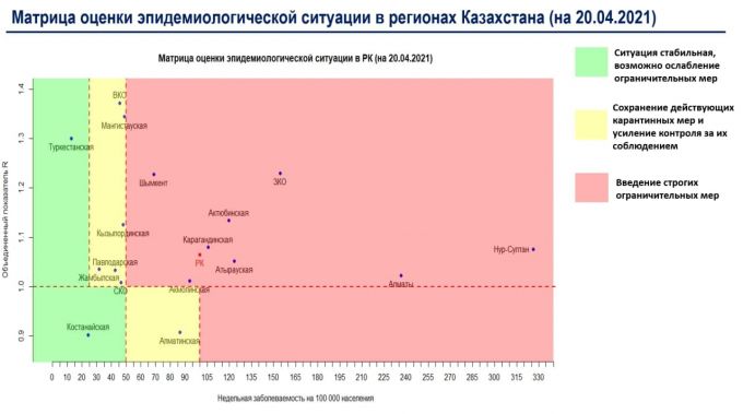Минздрав опубликовал матрицу оценки эпидемиологической ситуации в регионах Казахстана на 20 апреля, сообщает Caravan.kz