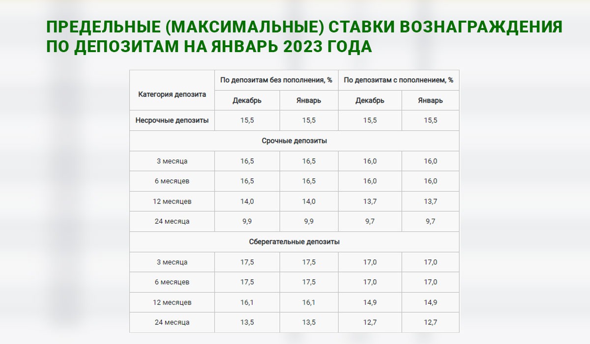 Казахстанский фонд гарантирования депозитов (КФГД) утвердил предельные (максимальные) ставки по депозитам в тенге на январь 2023 года, передает Azattyq Rýhy.