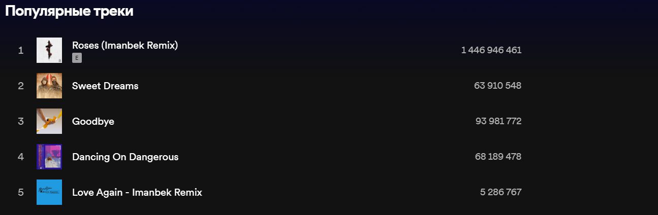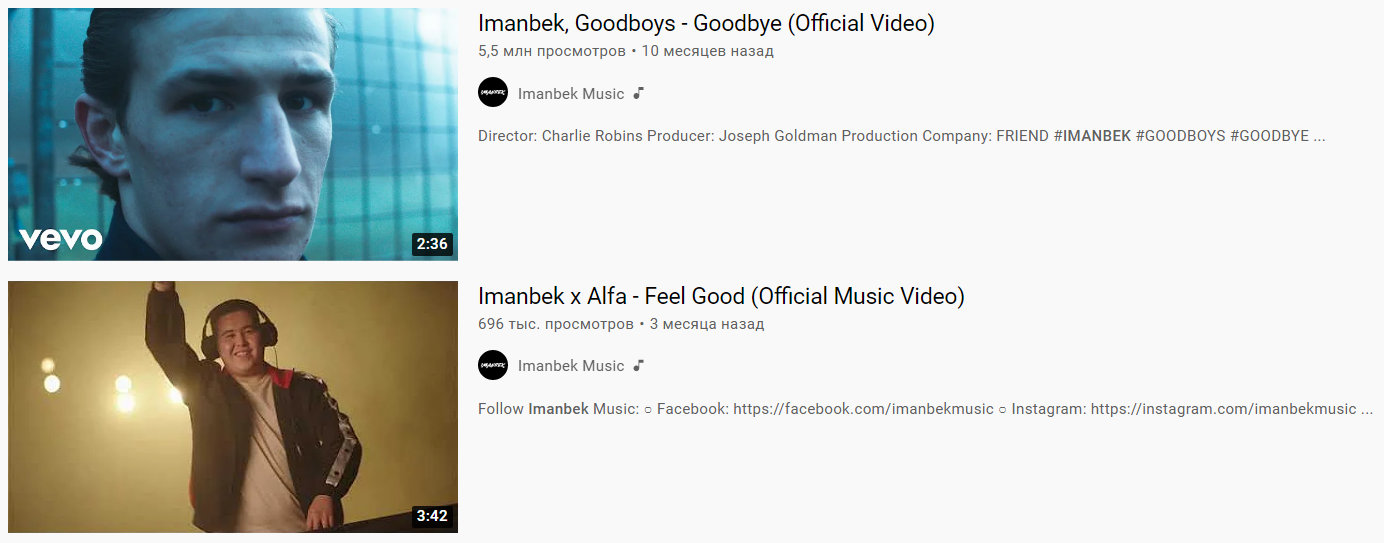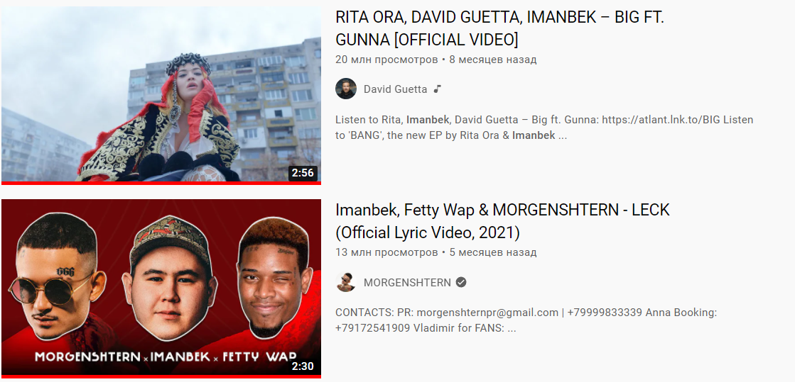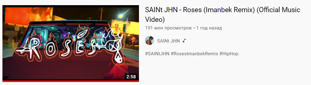 Для начала обратимся к популярнейшему видеохостингу YouTube, где артисты со всего мира выкладывают свои музыкальные видеоклипы. Самым просматриваемым клипом на песню Иманбека является "Roses", сейчас на нем уже более 191 миллиона просмотров, однако это видео размещено на канале автора оригинального трека SAINt JHN.