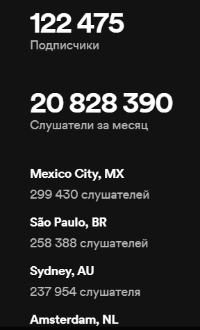 Сервис также позволяет узнать, из каких регионов чаще всего заходят послушать песни казахстанского диджея. Так, на первом месте — пользователи из Москвы и области, на втором — из Санкт-Петербурга и области, а на третьем — Краснодарский край. Казахстан находится только на девятом месте, нашу страну представляют слушатели из Алматинской области.