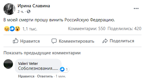Незадолго до происшествия журналист опубликовала пост у себя в Facebook, в котором просила винить в своей смерти Российскую Федерацию.