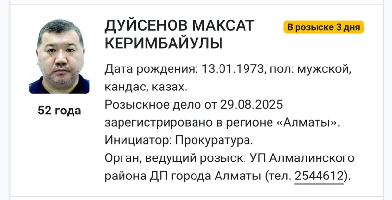 «В розыске 3 дня… Инициатор: Прокуратура. Орган, ведущий розыск: УП Алмалинского района ДП Алматы», – следует из портала ГП РК.
