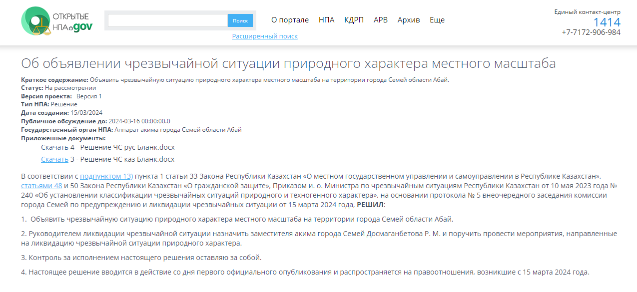 Обновлённая информация: проект с сайта "Открытые НПА" удалили. В пресс-службе акимата пояснили: "Этот проект был разработан в предвидении возможного ухудшения паводковой ситуации в городе. Однако, на данный момент ситуация остается стабильной, и угрозы подтопления нет. Поэтому проект решения был удален с портала «Открытые НПА». На повестке дня ЧС в городе не стоит".