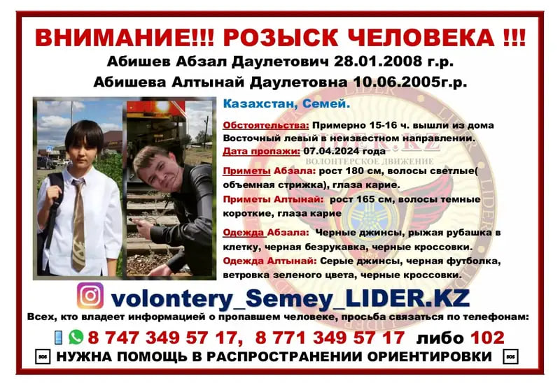 19-летняя Алтынай Абишева и 16-летний Абзал Абишев пропали в Абайской области, передает Caravan.kz.