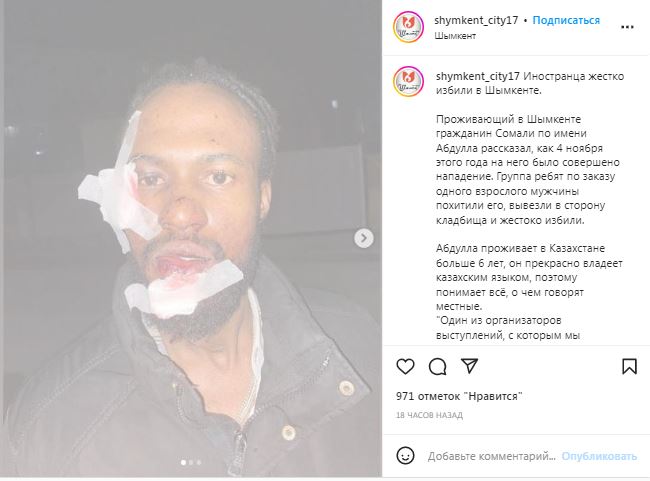 — Проживающий в Шымкенте гражданин Сомали по имени Абдулла рассказал, как 4 ноября этого года на него было совершено нападение. Группа ребят по заказу одного взрослого мужчины похитили его, вывезли в сторону кладбища и жестоко избили, — сообщил паблик.