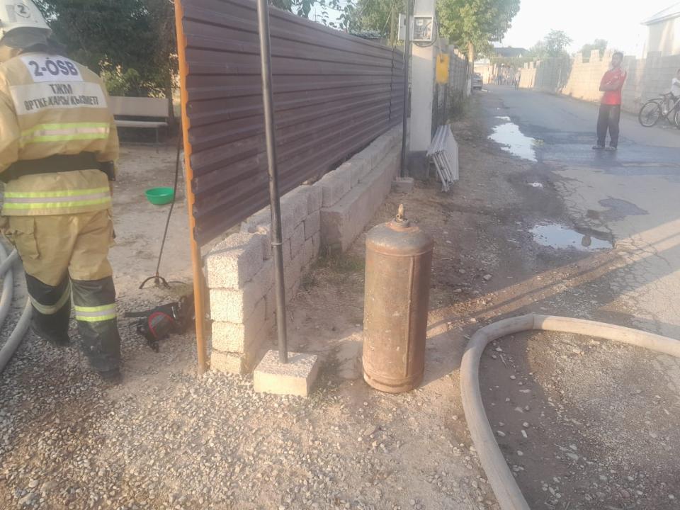 Старший пожарный-спасатель пожарной части №2 сержант гражданской защиты Битанов Галымжан Дуйсенбекович вынес 50 л. газовый баллон в безопасную зону. его охладили.