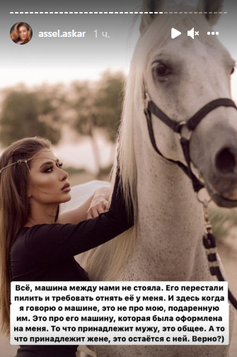 Асель Аскар в сториз в Instagram уточнила, что продала машину гражданского мужа, а не "Гелендваген", который он дарил ей в мае, передаёт медиа-портал Сaravan.kz.