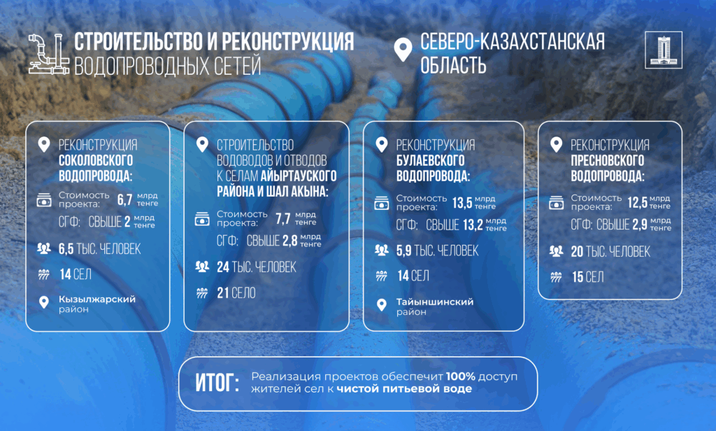 На эти средства будут реализованы 48 проектов, направленных на улучшение водоснабжения региона. Среди них – реконструкция Соколовского, Булаевского и Пресновского групповых водопроводов, а также строительство новых водоводов и отводов к сельским населенным пунктам Айыртауского района и Шал Акына, подключенным к Кокшетаускому групповому водопроводу.