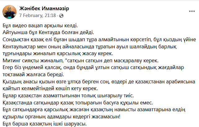 "Прислали это видео в Whatsapp. Говорят, что это было в Кентау. Поэтому к азахи должны показать, что не собираются терпеть подобное. Жители Кентау и окрестных сел должны собраться на митинг у дома этой девушки и заклеймить ее позором как предательницу. Если мы будем молчать, это продолжится. Мать, которая выдала дочь замуж за иностранца, тоже должна навсегда уехать в Аравию. Таких надо лишать гражданства Казахстана. Предатели не имеют права ходить по казахской земле. Сотрудники правоохранительных органов не должны мешать достойным казахстанским гражданам выступить против подобных предателей. Это внутреннее дело всех казахов", — написал на своей странице Facebook Жанибек Иманмазир.