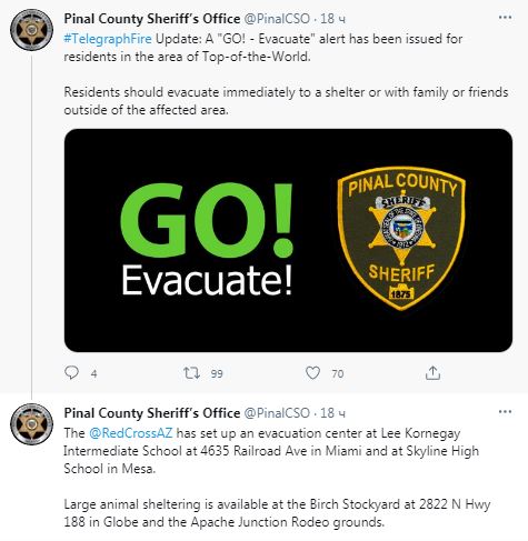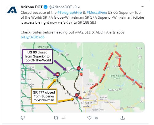 По данным национальной службы InciWeb, на территории штата зафиксировано два крупных пожара. Один из них вспыхнул в 100 километрах к востоку от Феникса. На данный момент огонь уже распространился на площадь почти в 14 тысяч гектаров.