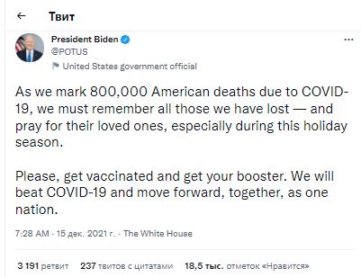 — Отмечая трагическую веху в 800 тысяч смертей американцев из-за COVID-19, мы вспоминаем каждого человека и их жизни и молимся за тех, кого они оставили позади. Я призываю всех американцев: выполняйте свой патриотический долг, чтобы сохранить нашу страну в безопасности, защитить себя и тех, кто вас окружает, и почтить память всех тех, кого мы потеряли. Сейчас самое время, — заявил президент.