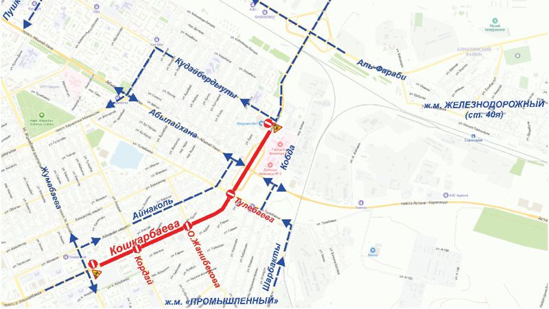 — Для транспорта жилого массива «Железнодорожный» (ст. 40я) необходимо заранее планировать маршрут через проспект Аль-Фараби в направлении улиц Пушкина и Кобда, а со стороны улицы Жумабаева или жилого массива «Пригородный» использовать параллельные улицы Айнаколь или переулок Кобда, — сообщила пресс-служба ДП Нур-Султана.