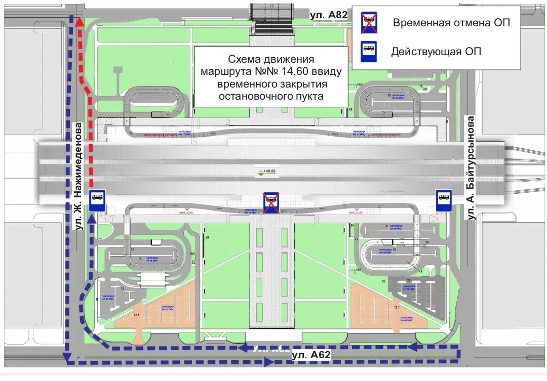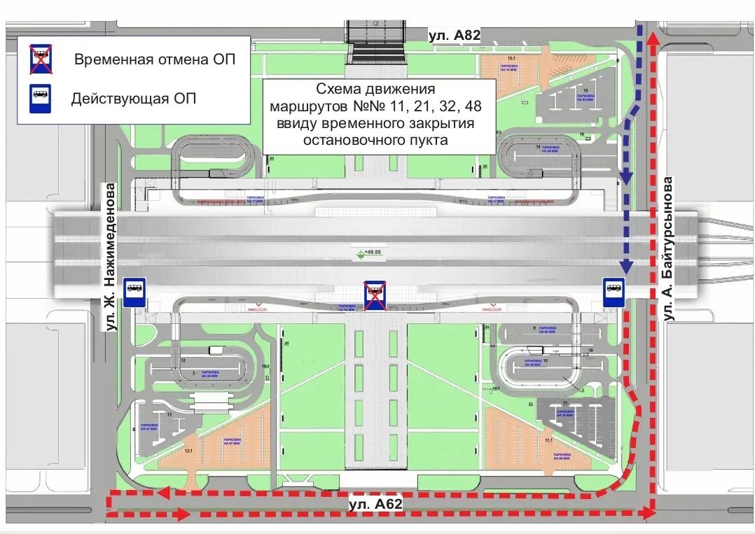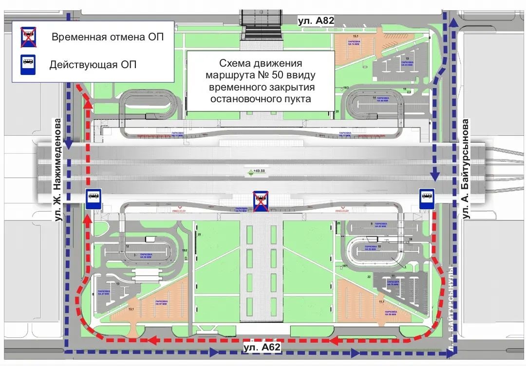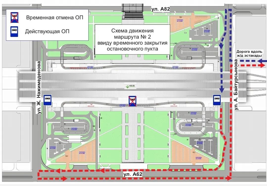 — Уважаемые пассажиры! В связи с временным закрытием остановочного пункта на территории ЖД вокзала "Нурлы жол" временно изменены схемы движения маршрутов №№ 2, 11, 14, 21, 32, 48, 50, 60, — говорится в обращении к населению.