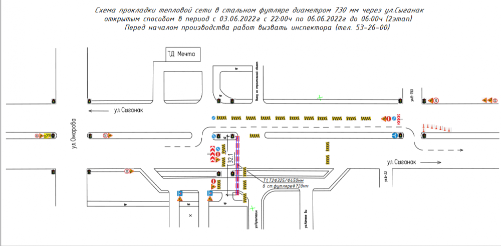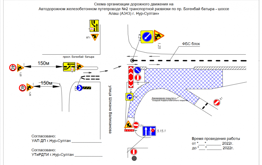 Кроме того, с 3 июня по 6 июня 2022 года, движение транспортных средств по Путепроводу №2 (проспект Богенбай батыра — шоссе Алаш), от улицы Валиханова будет частично перекрыто. При движении со стороны улицы Айманова по проспекту Богенбай батыра транспортные потоки распределят на сторону дороги встречного направления, с расстановкой соответствующих дорожных знаков и видимых ограждений.