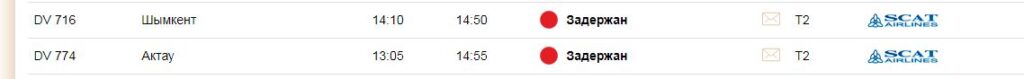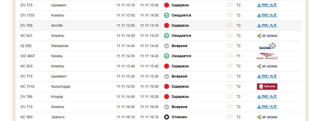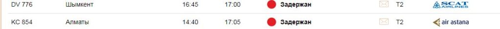 Борт из Костаная (KC 7342) авиакомпании FlyArystan опаздывает ориентировочно на 50 минут. Кроме того, задерживаются рейсы из Алматы (KC 853, Air Astana) и Атырау (DV 766, Scat).