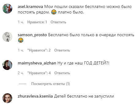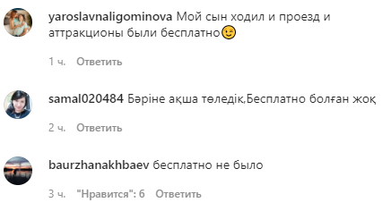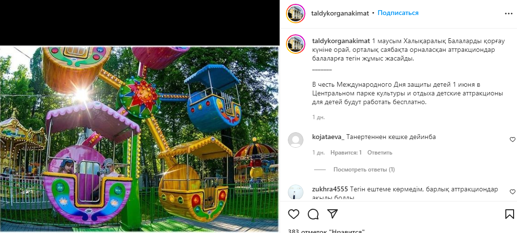 "Вчера, когда я вышел в прямой эфир, люди начали писать, что на аттракционах требовали покупку билета для детей. Когда я был там утром, все было бесплатно для детей, но неужели хозяева аттракционов схитрили и решили сделать платным, хотя акимат дал информацию, что весь день будет бесплатно?" — подписали пост в группе.