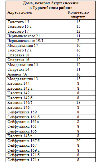 В Турксибском районе планируют снести самое большое количество домов. Только на улице Сейфуллина их целых десять. В основном это каркасно-камышитовые «двухэтажки» вокруг которых вырос частный сектор. Все эти полуразрушенные дома буквально утопают в зелени. Идешь от одного дома до другого по узкой тропинке, а вокруг деревья и кустарники.