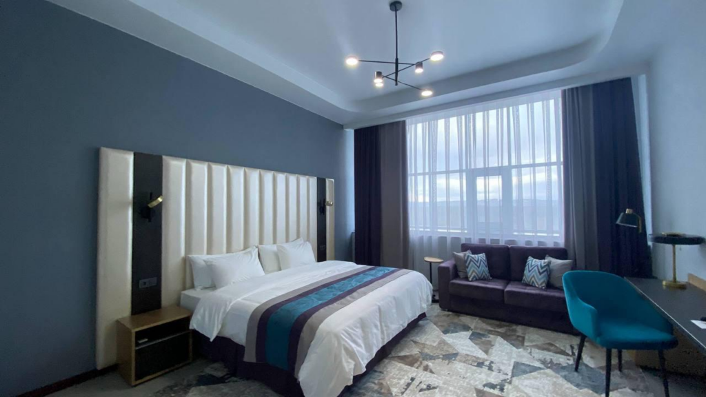 У гостиничного комплекса продумана вся инфраструктура – в здании семь этажей и 46 номеров (четыре президентских номера, два люкса, восемь полулюксов и 32 стандартных номера). На первом этаже расположены фойе, lounge bar и конференц-зал на 50 человек. Второй этаж занимает банкетный зал на 200 гостей с гримеркой и VIP-комнатой. На третьем этаже работает ресторан на 120 гостей. С четвертого по седьмой этаж размещен номерной фонд.