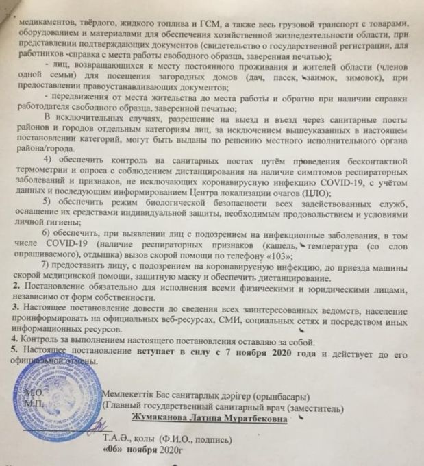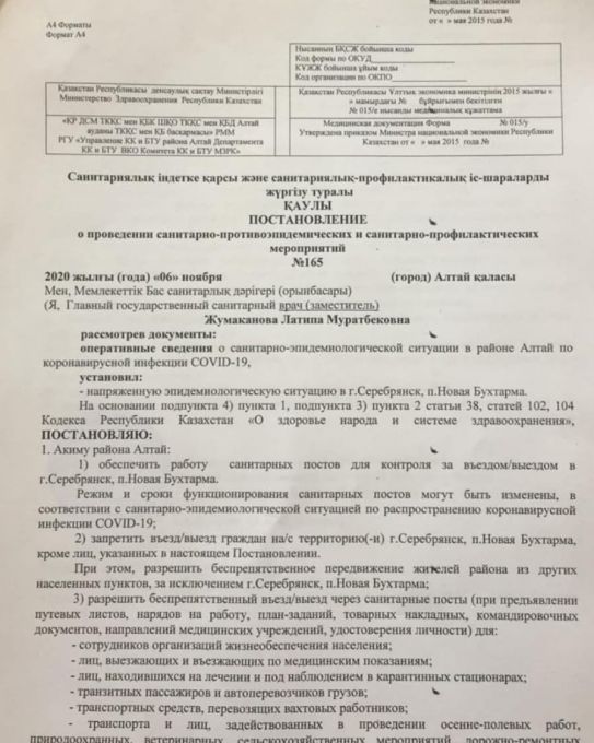 Согласно документу, въезд в Серебрянск, Новую Бухтарму, равно как и выезд из них запрещены, за исключением некоторых категорий людей, указанных в постановлении.