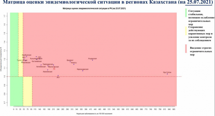 В "красной" зоне: Нур-Султан, Алматы, Шымкент, Акмолинская, Актюбинская, Атырауская, Восточно-Казахстанская, Жамбылская, Западно-Казахстанская, Карагандинская, Костанайская, Кызылординская, Мангистауская, Павлодарская и Северо-Казахстанская, Туркестанская области.