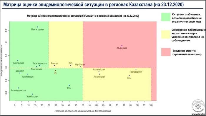 Согласно матрице оценки эпидемиологической ситуации по COVID-19 в регионах Казахстана, по состоянию на 23 декабря сложилась следующая ситуация: