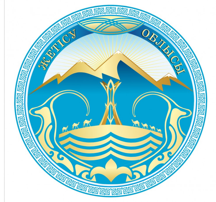 Новый герб в форме круга выполнен в сине-голубом и золотом цветах государственного флага. В центре расположен символ города Талдыкоргана "Монумент Жетісу", стоящий на фоне гор, из-за которых проглядывает солнце, и над этим – шанырак. Внизу изображен караван верблюдов как олицетворение Великого шелкового пути, волны, представляющие семь рек Жетісу, озера Алаколь и Балхаш. Место по бокам герба занимают два архара, тоже имеющие важное символическое значение для региона. Название области написано сверху золотыми буквами.