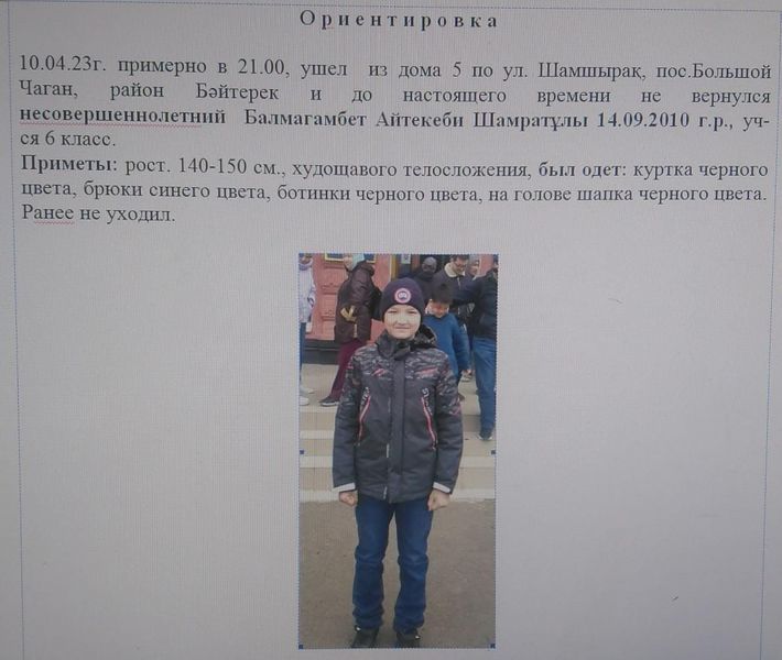 10 апреля в 21:00 из дома в селе Большой Чаган района Байтерек ушёл из дома и до настоящего времени не вернулся ученик 6-го класса Айтекеби Балмагамбет, 2010 года рождения. Мальчик был одет в куртку чёрного цвета, синие брюки, чёрную шапку и ботинки чёрного цвета.