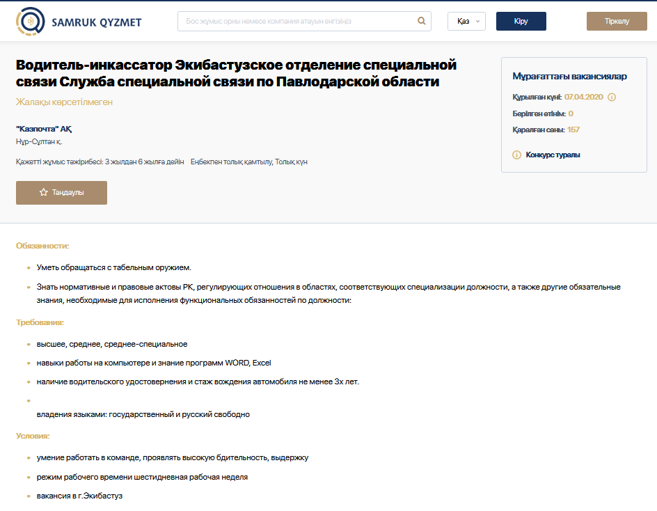 Вакансия Java-разработчика на скриншоте находится в категории "Бухгалтерия и финансы". От специалиста требуется умение водить машину и владеть табельным оружием, знание программ Wodr и Excel, а также высокая бдительность. Хотя в графе "Город" указан Нур-Султан, работать предлагается в Экибастузе.