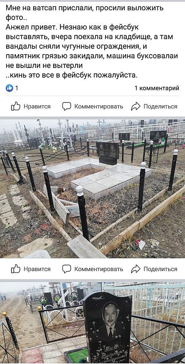 – У нас такого факта (связанного с публикацией в “Фейсбуке”. – Прим. авт.) по регистрации нет, – заявил заместитель начальника управления полиции г. Атырау Айбек ТЛЕШЕВ. – Официально к нам по этому поводу никто не обращался. По идее, мы их должны вызвать, нам нужны данные заявителей. Обязательно проверим, будем реагировать. В прошлом году было 3 факта воровства на кладбище. Воров, укравших чугунные ограждения, найти не удалось, а похищенные ограждения отыскали в пункте приема металлолома.