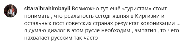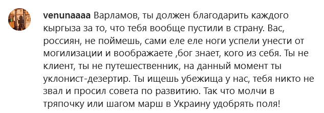 ", — написал блогер на своей странице в Instagram.На момент этой публикации под постом Варламова появилось более 5 тысяч комментариев. Небольшое число подписчиков поддержало Илью, но многие, в том числе проживающие в Кыргызстане и Казахстане славяне, написали, что Илья продемонстрировал "имперское" и "колониальное" мышление.