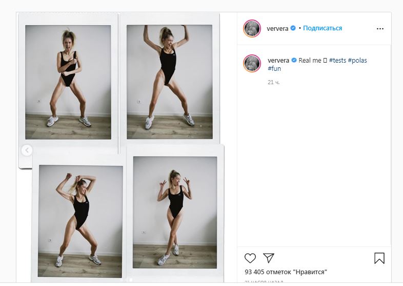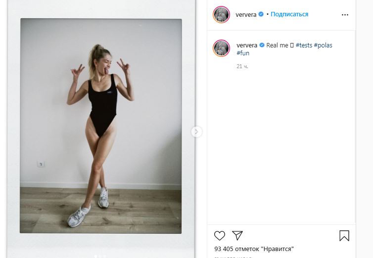 Знаменитая блондинка наполнила инстаграм-канал новым постом. Звезда добавила серию снимков в сплошном черном купальнике. Вера Брежнева надела на ноги массивные белые кроссовки, а волосы забрала в высокий хвост.