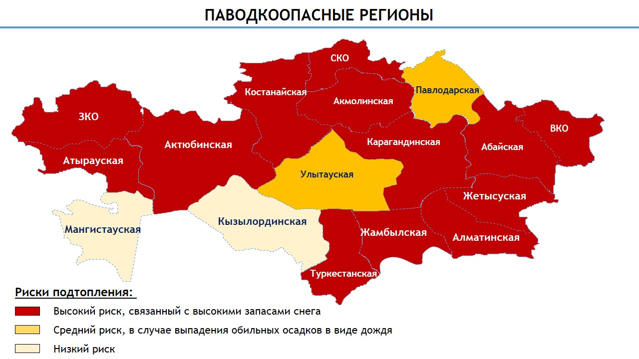 В ведомстве ещё зимой проанализировали величину запасов воды в снеге, осеннего увлажнения почвы а также глубину промерзания почвы. И они составили карту регионов Казахстана, на которой красным отмечены области, в которых очень высок риск затоплений.