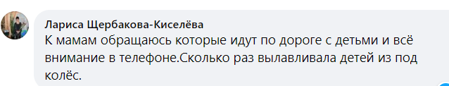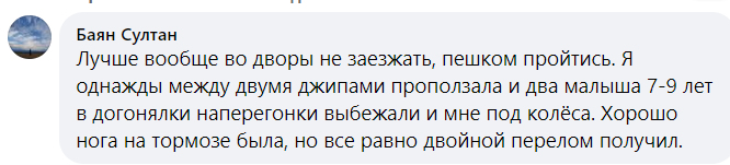 "Лучше вообще во дворы не заезжать, пешком пройтись. Я однажды между двумя джипами проползала и два малыша 7-9 лет в догонялки наперегонки выбежали и мне под колёса. Хорошо нога на тормозе была, но все равно двойной перелом получил", "Я бы ещё обратилась к родителям. Иногда наблюдаешь отсутствие самосохранения к себе и к своему ребенку, стоят вдоль дороги, ловят такси, ребенок — непоседа, вертится туда-сюда… Держите детей за руку, пожалуйста!", "К мамам обращаюсь которые идут по дороге с детьми и всё внимание в телефоне.Сколько раз вылавливала детей из -под колёс", — пишут участники группы в комментариях.