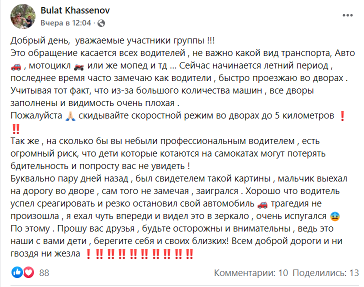Поэтому прошу вас, друзья, будьте осторожны и внимательны, ведь это наши с вами дети, берегите себя и своих близких! Всем доброй дороги и ни гвоздя ни жезла", — опубликовал обращение а городском паблике автомобилист Bulat Khassenov.