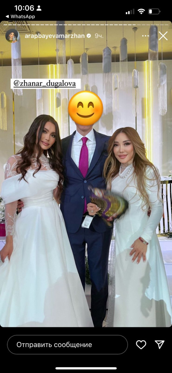 "Привет, друзья! Итак, как и обещала, я вам расскажу. Сегодня наконец-то выходит замуж наша подруга, супер-певица и сестра Жанар Дугалова наконец-то. Отлично! Сегодня свадьба узату", — рассказывает Маржан Арапбаева. Видео тут же разлетелось по пабликам.
