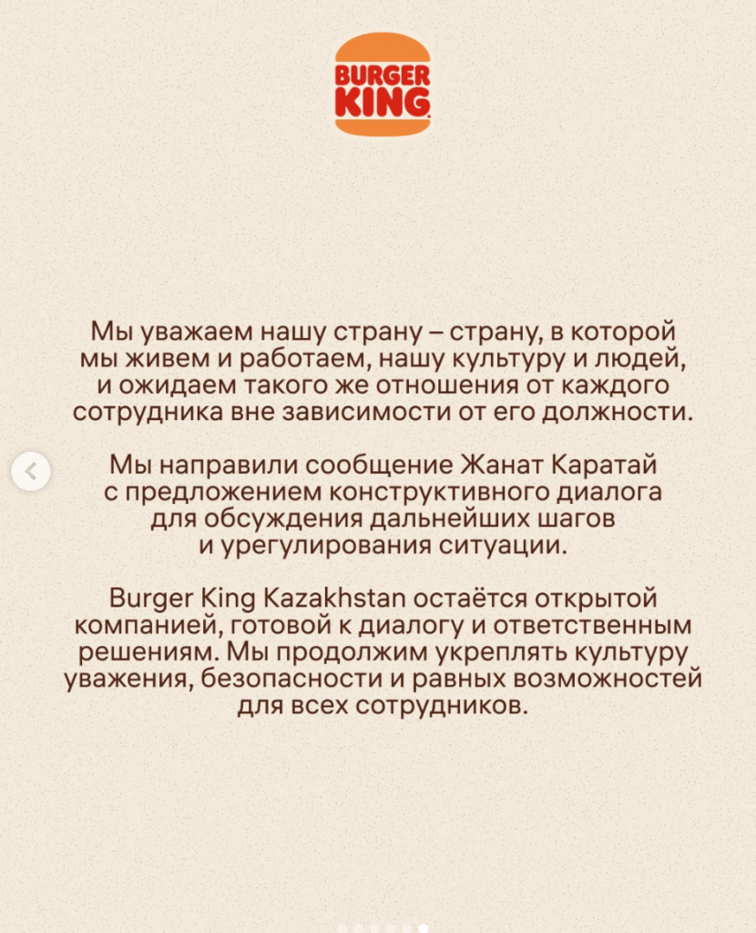 Недавно Caravan.kz писал о том, что мать повара популярной сети фастфуда пожаловалась на то, что её сына «травят». Она рассказала, что это началось с приходом нового регионального управляющего — четыре года до этого повар работал без проблем. В Burger King вскоре отреагировали на жалобу и сообщили, что «управляющие Сергей и Анастасия больше не являются сотрудниками компании». Казалось бы, на этом можно было закончить…