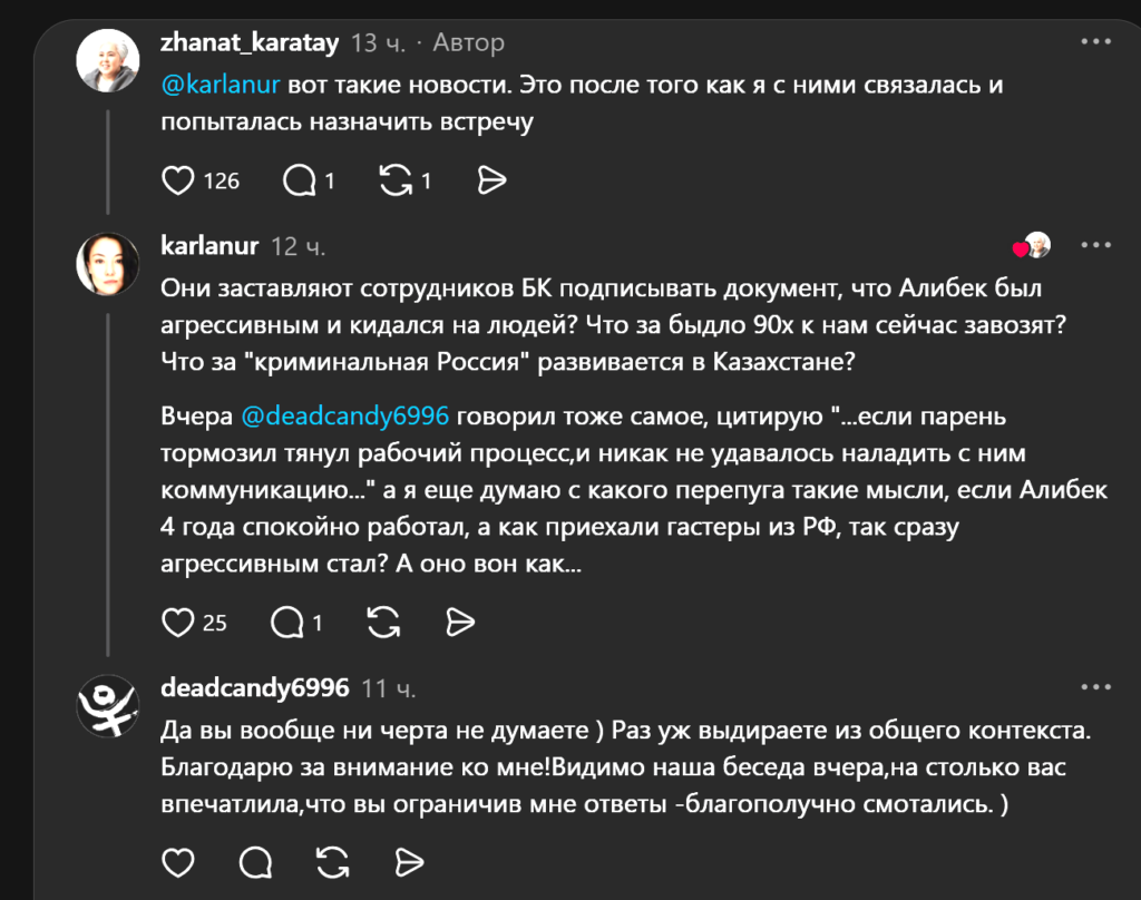 Жанат утверждает, кстати, что она связалась с компанией сама, чтобы назначить встречу, и после этого получила такое сообщение. В комментариях одна из пользовательниц поставила под сомнение агрессию Алибека и упомянула пользователя с ником deadcandy6996. По её словам, накануне от него она тоже слышала критику в адрес этого повара, и это показалось ей странным. Упомянутый ответил, что его слова выдернули из контекста, и подчеркнул, что его возможность комментировать ограничили.