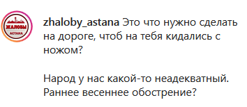 "Это что нужно сделать на дороге, чтоб на тебя кидались с ножом? Народ у нас какой-то неадекватный. Раннее весеннее обострение?" — говорится в подписи к видео.